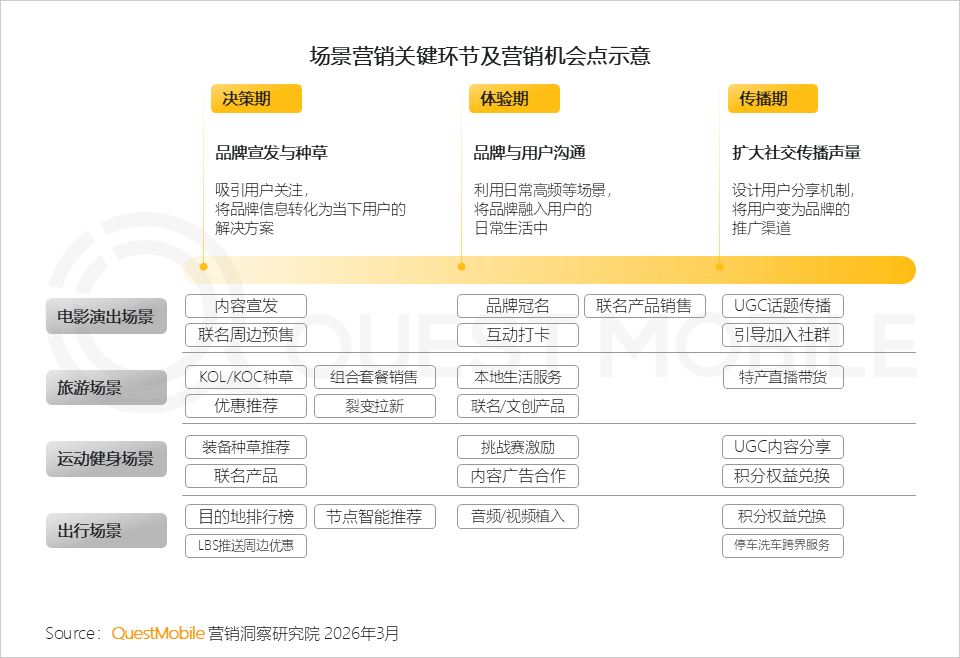 如典型线下场景(电影/演唱会、旅游、运动、出行等),品牌可通过特点场景特定节点,触达目标人群,实现转化、复购、心智占领的三重目标。