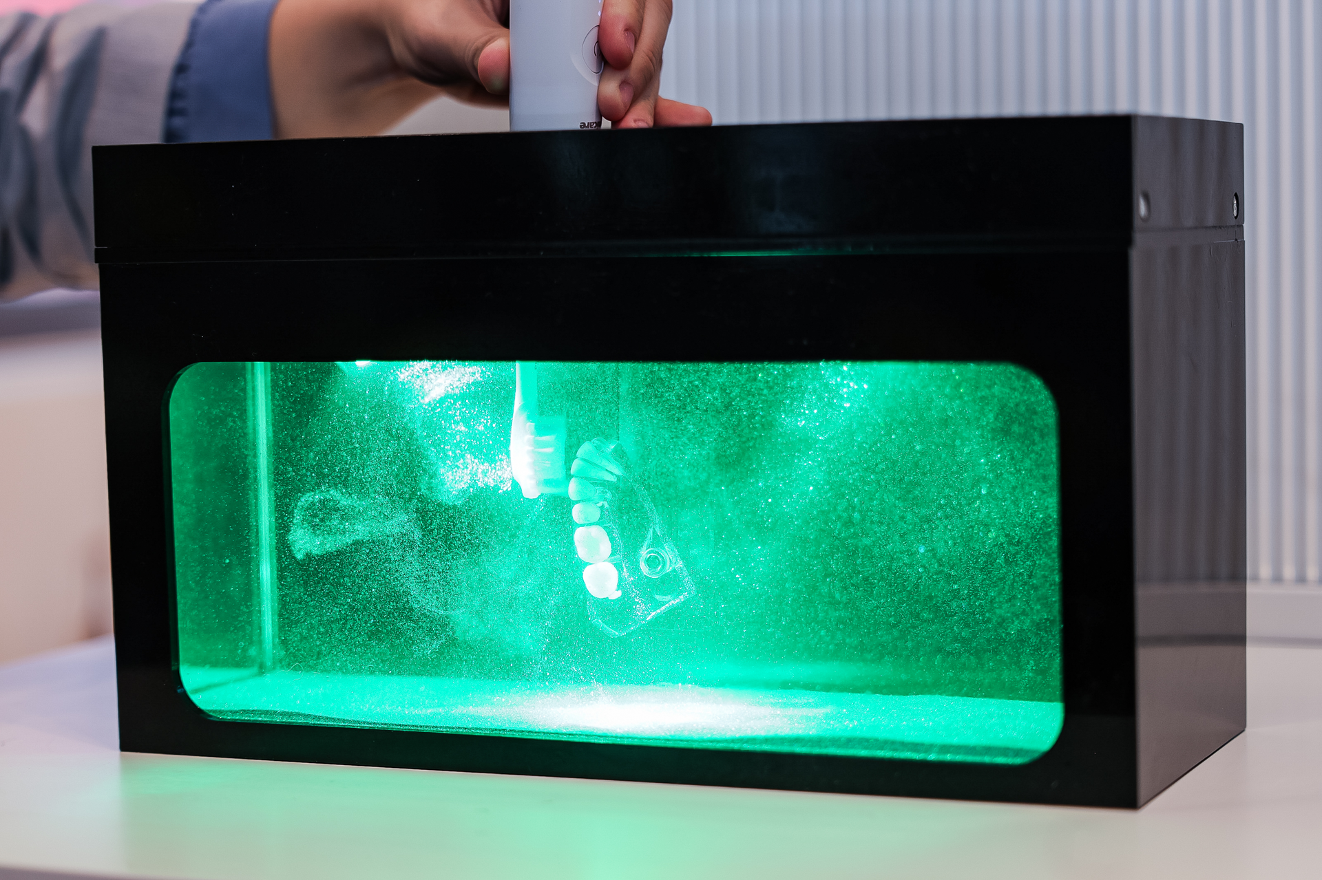 - 微泡水流实验:在装满激光油的实验装置中,可以清晰地看到在高频振动下飞利浦电动牙刷激发出大量的微泡水流,轻盈渗透、精准深入模拟齿缝的每一处死角,将隐匿污渍悄然带走,让那些日常刷牙难以触及的区域,也能实现温和高效清洁。这正是飞利浦「专业声波洁牙科技」所独具的清洁力。