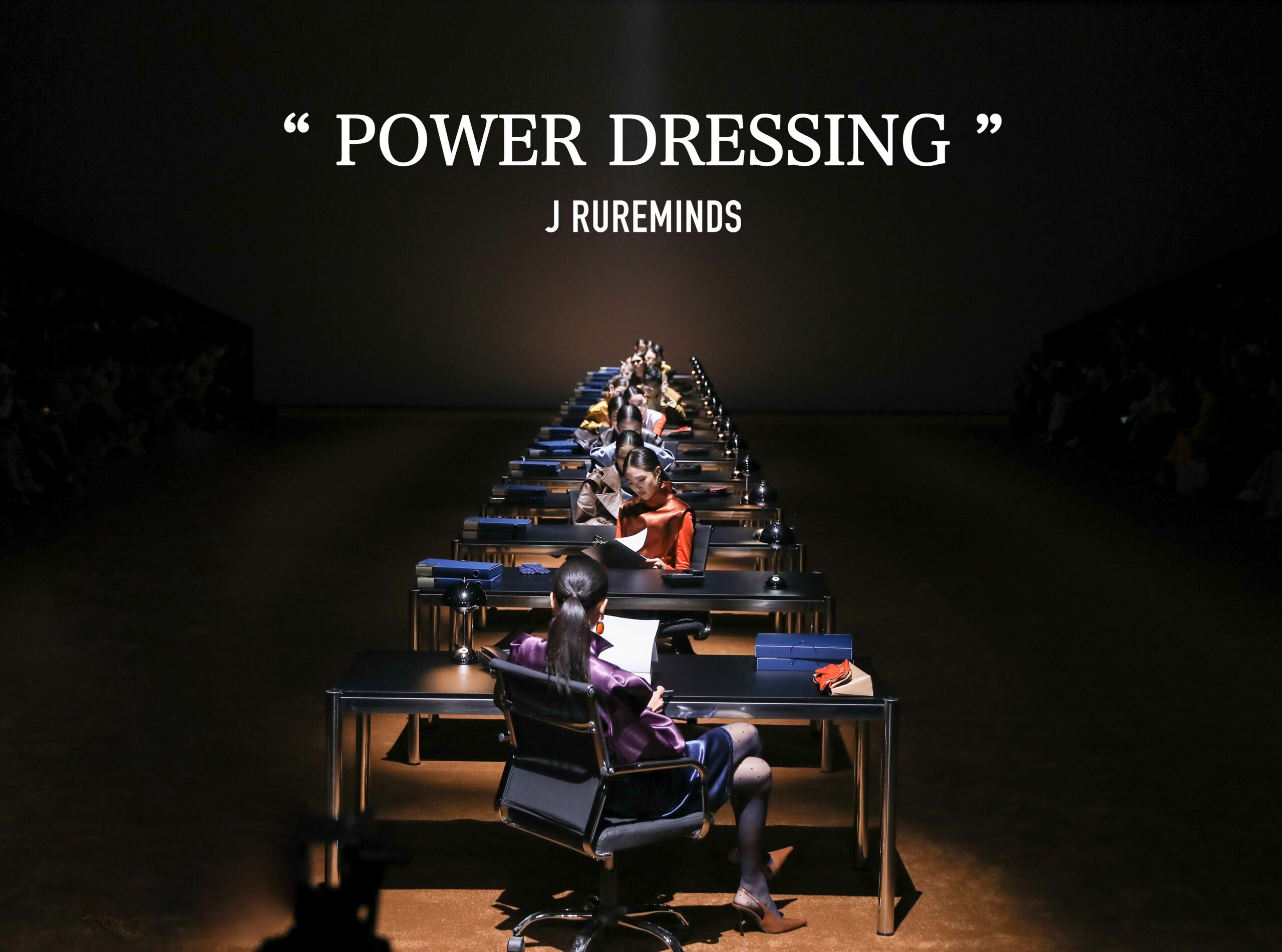 定格1980年代的职场剪影,女性们踩着利落步履闯入由男性主导的职场天地,在刻板规则与阶层壁垒中,默默积攒破局力量。J RUREMINDS 26秋冬系列,以秀场复刻年代职场,整齐排布的员工工位与反向陈设的领导办公桌相对而立,冷调场景里满是传统职场的压抑与博弈感。