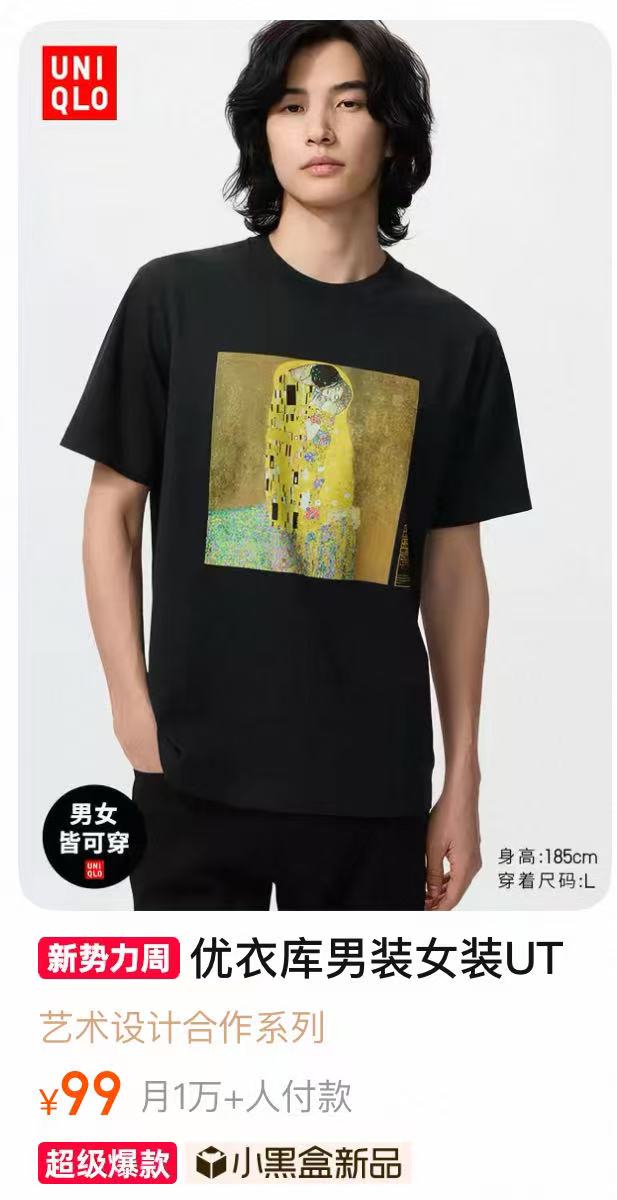 优衣库成了“预言家”,提前押对题目。一件优衣库MoMA联名T恤,因为印着《吻》这幅画,被粉丝迅速锁定为野生的专辑周边。原本月销2件的冷门款,三天卖到断货,登顶天猫印花文化衫热销榜。
