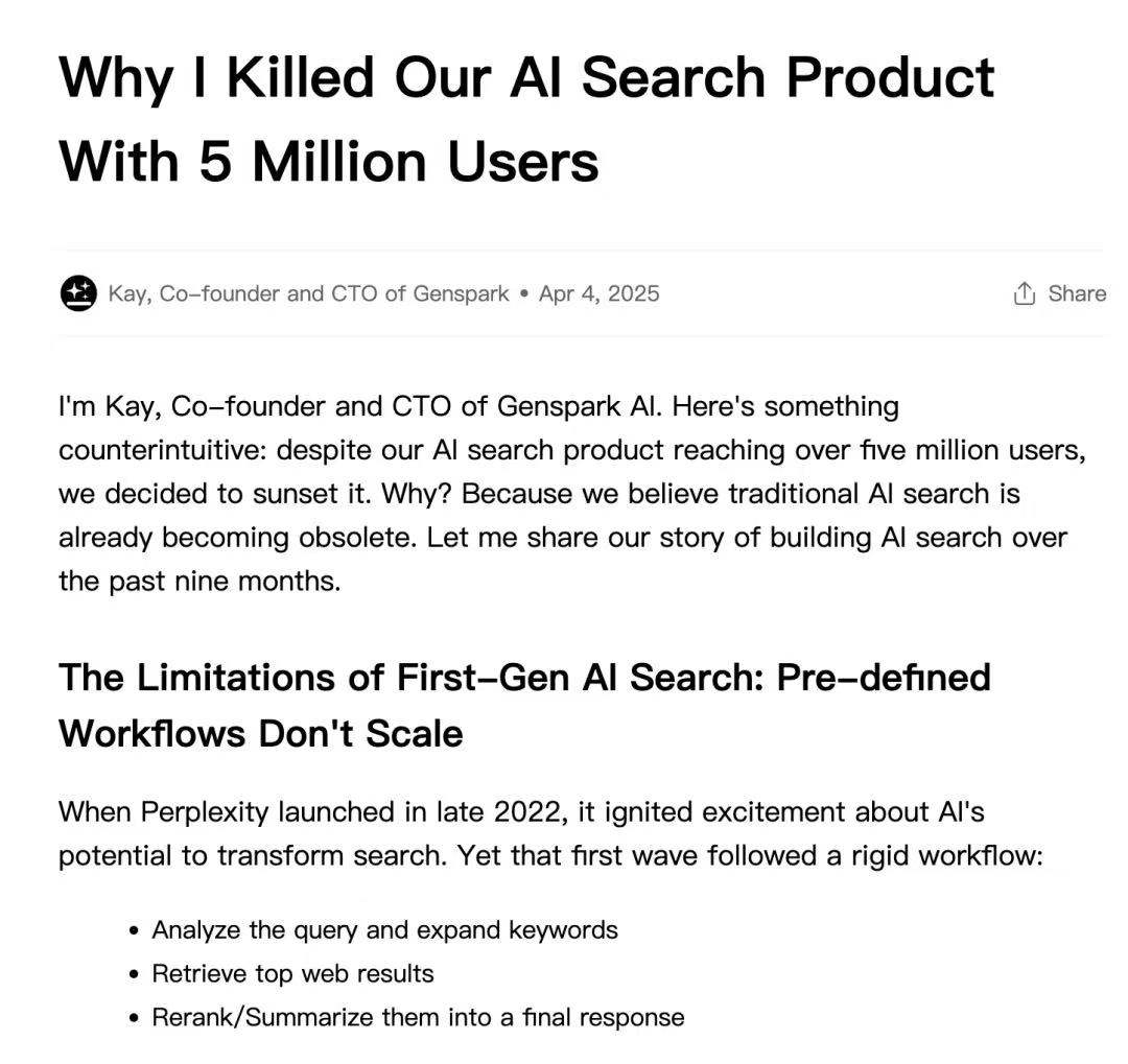 当行业共识逐渐转向 Agent,AI 搜索赛道迅速降温。Genspark 也掉头,从 AI 搜索引擎转型为 AI Agent。