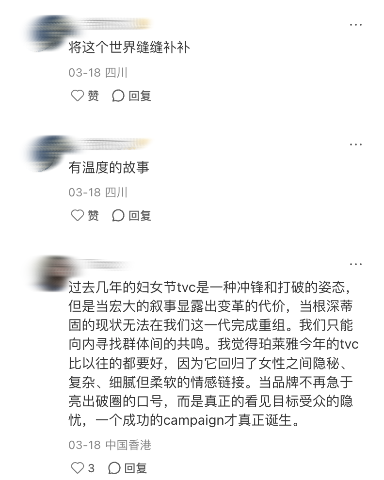 一位在女性朋友看完《我认得你》后,看出了品牌的用心,随即又感到心酸。“光是指认还不够,最后还是女性和女性相互救赎,这太不够了。”她说,“一切都太慢了,头部化妆品品牌在妇女节应该拍出更先进的东西,鼓励男性、鼓励公司,而不只是鼓励女性。”
