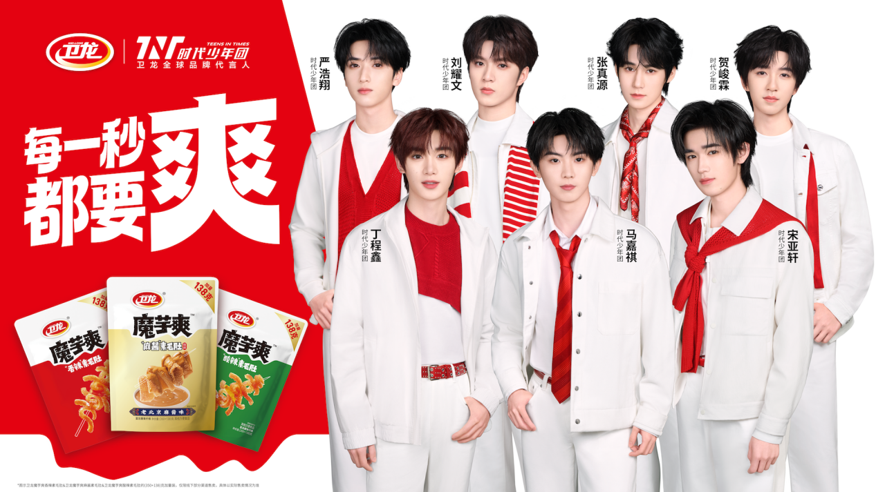 时代少年团由马嘉祺、丁程鑫、宋亚轩、刘耀文、张真源、严浩翔、贺峻霖七位成员组成。作为Z世代偶像代表,他们以青春阳光的形象与持续精进的专业表现,成为年轻群体中的重要精神符号。从不断突破自我的舞台表现,到对梦想的长期投入与坚持,这种充满生命力的成长轨迹,与卫龙二十余年来坚持品质、持续创新的发展路径高度共振。其鲜明的青春气质与广泛的圈层影响力,也与卫龙深耕年轻市场、不断贴近年轻消费者情感需求的方向完美契合。