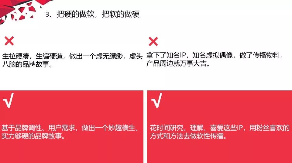 第三步,把硬的做软,把软的做硬。把硬的东西做软,强调的是传播手段,传播过程植入巧妙毫无违和感,不要把强行拉虎皮做大旗,最后画虎不成反类犬。把软的东西做硬,强调的是品牌故事是有「硬核」的、立体饱满的、不可替代的,而不是一个虚头巴脑毫无内涵的东西。
