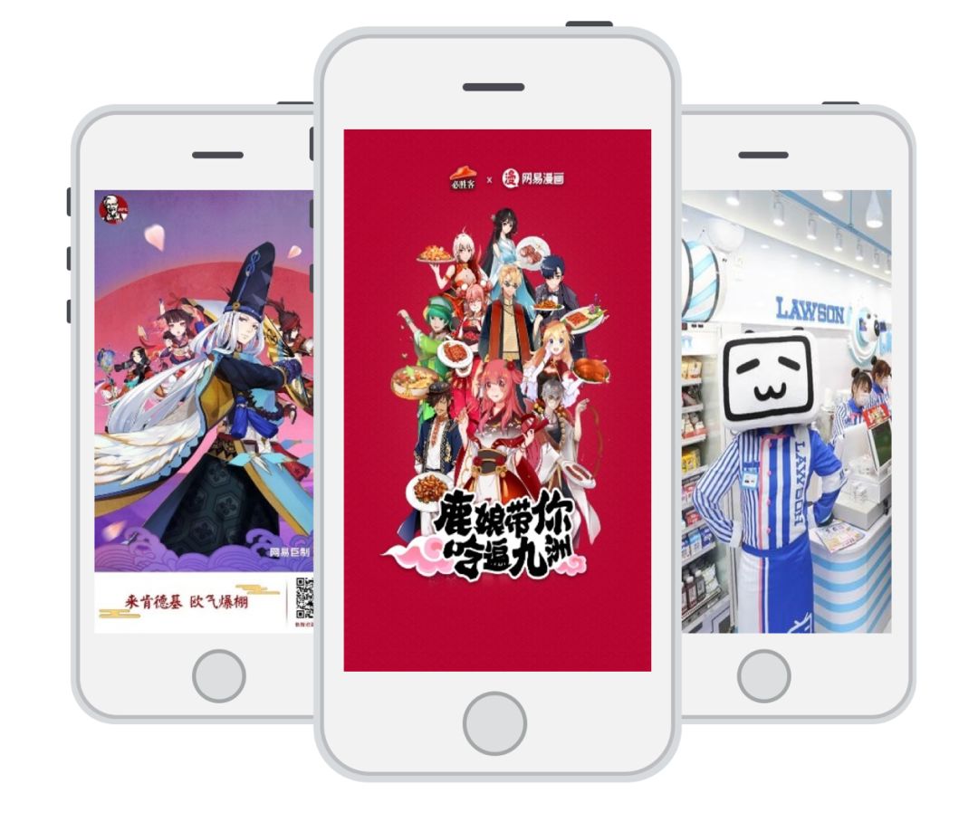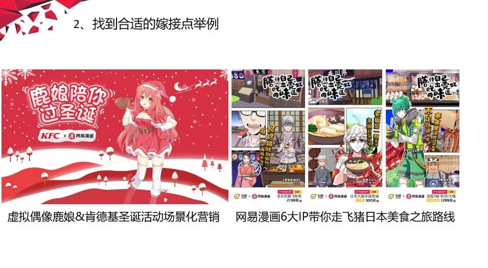 例如网易漫画「虚拟偶像鹿娘X肯德基圣诞活动」的场景化营销,以及网易漫画「6大IP带你走飞猪日本美食之旅路线」,就是在二次元IP与品牌之间找到链接点之后,利用虚拟人物代言、产品作为内容植入二次元、二次元破壁三次元玩场景化营销等手法,与二次元爱好者玩在一起。