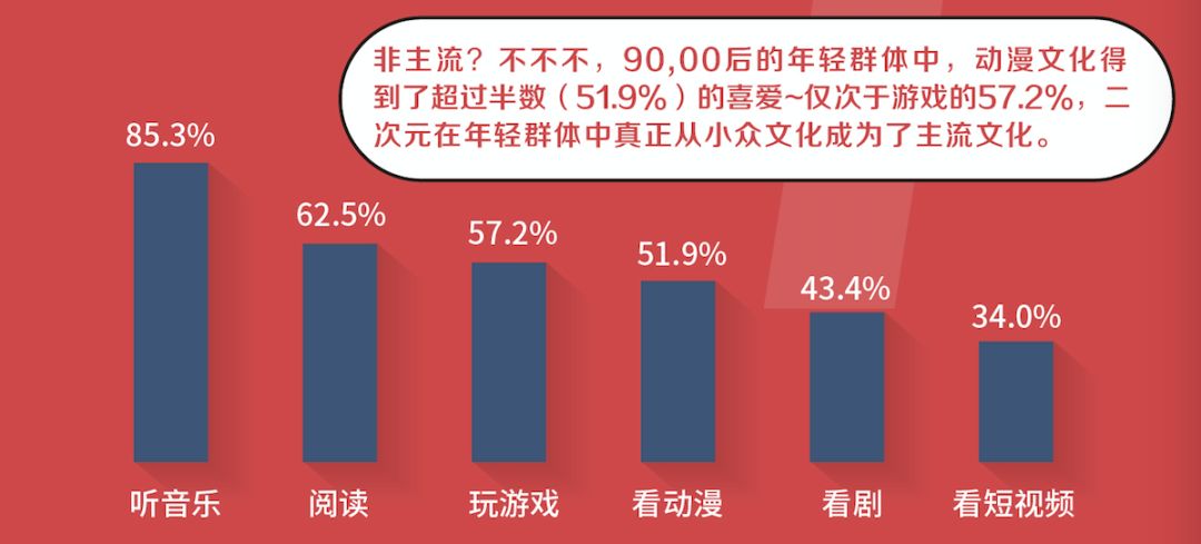 报告显示,在诸多休闲活动中,有超过半数(51.9%)的90,00后选择「看漫画」,受欢迎程度仅次于「打游戏」(57.2%),远超「看剧、看短视频」。大数据显示,二次元文化在年轻族群中由小众文化正在主流化。