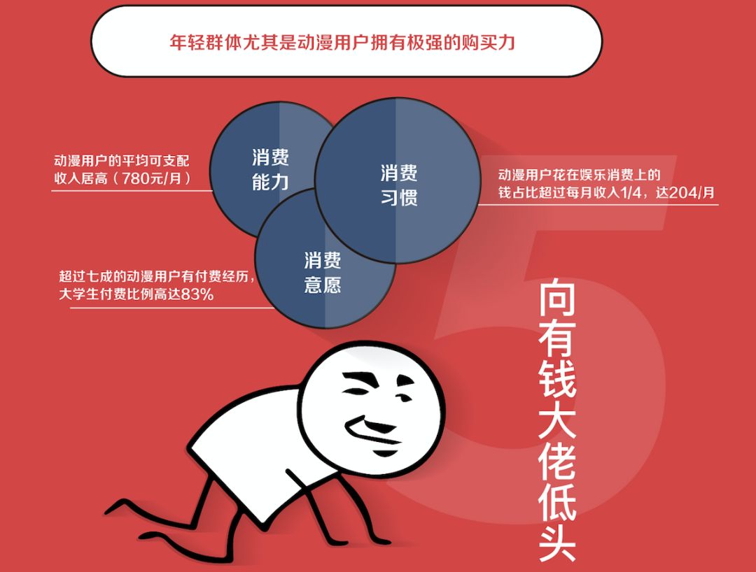 撑起二次元世界的,到底怎样一群人?据网易漫画这份年轻人行为报告来看,他们男女比例约为6:4,大多居住在东南沿海,因为单身所以消费能力很强,且很乐意为漫画等娱乐产品买单。据艾瑞数据显示,学生群体平均每月花在二次元兴趣爱好上的钱,占到其零花钱总额的21.4%,高达204元/月。