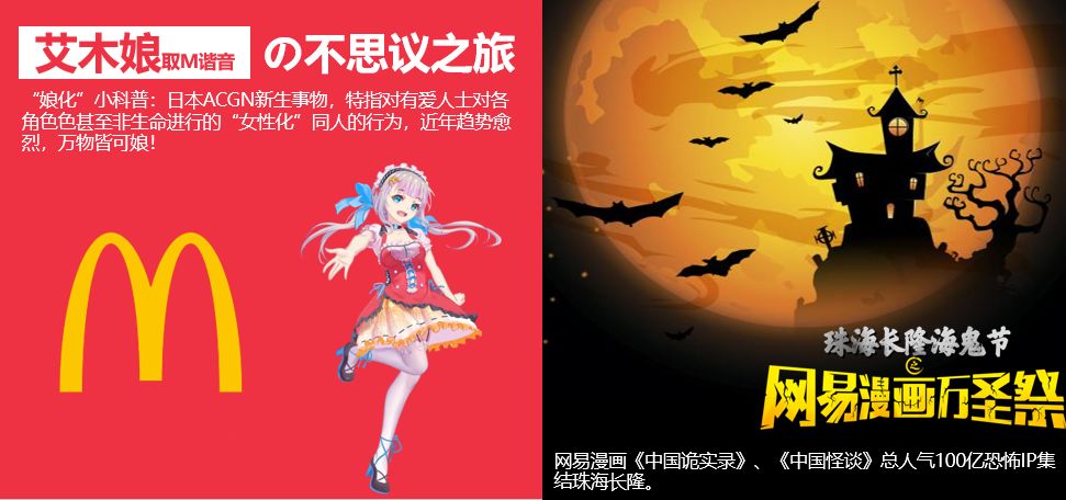 如网易漫画为麦当劳创作的「艾木娘」形象,就属于基于麦当劳本身强大的品牌故事,量身定制专属IP故事。而网易漫画为珠海长隆度假区创作的「长隆万圣节」,就是典型的因为品牌本身较为年轻缺乏故事性,而寻求故事性强大、契合度高的二次元IP来拉品牌一把。