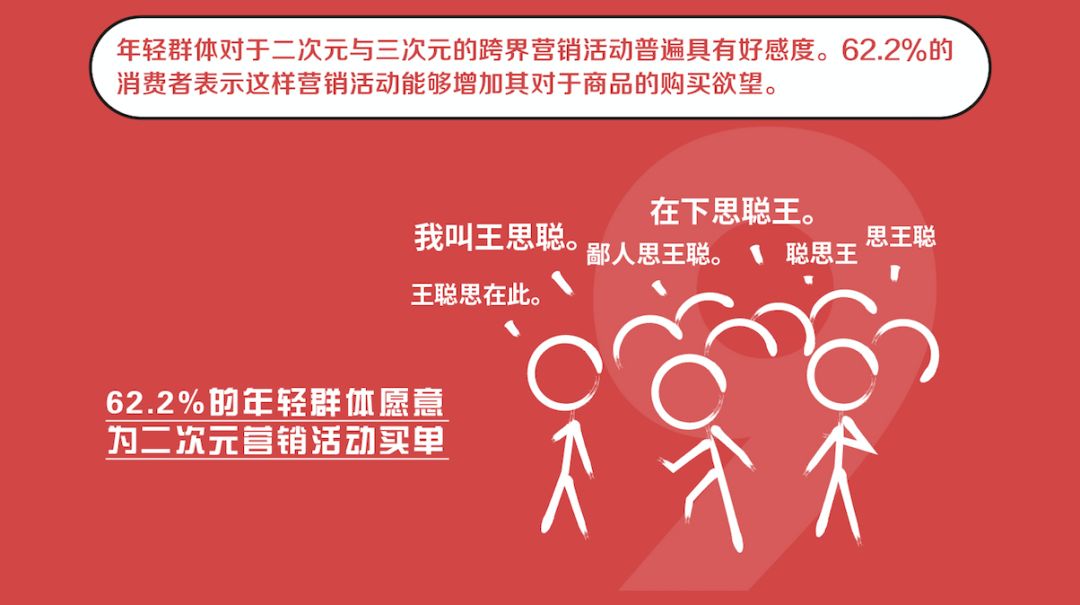 另据报告显示,二次元虚拟偶像,对于90,00后也充满诱惑力;并且他们对于二次元与三次元的跨界营销活动普遍充满好感,转化率高达62.2%。可以说破壁力MAX!