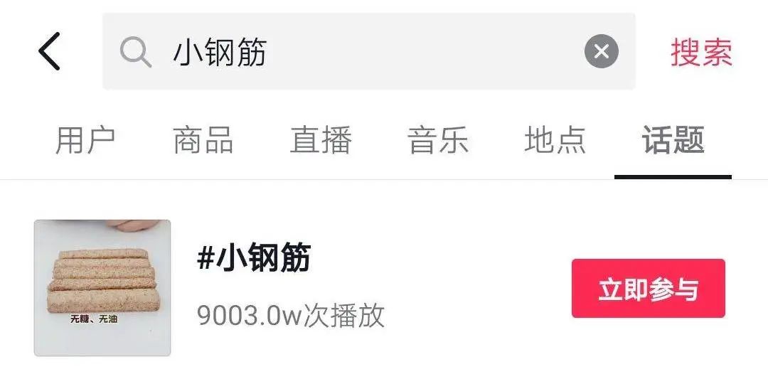 比如用“小钢筋”去敲盆碗,其产生的声音节律既适配短视频的传播特征,又能最大程度展现出饼干“脆”的特点,很容易就造出爆款内容。目前抖音搜索#小钢筋 的话题播放量已经超过9003万次,至今仍有商家在不断模仿我们。