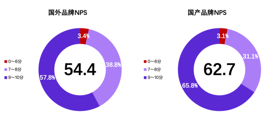 在消费者打分后,将给出9分和10分的用户定义为推荐者口碑用户,而给出0–6分的消费者定义为贬损者问题用户,净推荐值即是推荐者占比减去贬损者占比。净推荐值越高,意味着在消费者中正向宣传人数越多,有助于品牌口碑建设和在存量市场环境下用户分裂。