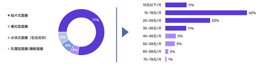 整体上,贴片式面膜仍是市场主流,77%消费者更偏好贴片式面膜,近9成面膜产品每片单价在39元以内,其中42%的消费者选择单价在10–19元的产品。