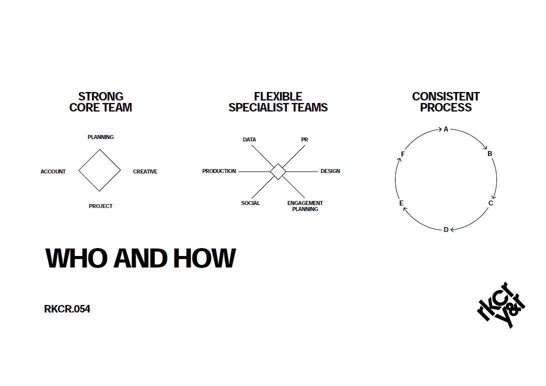 其一,针对不同情况,你应该拥有不同的人员配置,他们能创造数倍于普通模式的效率。因为不同形态的小组能够应对不同级别的问题,有时你需要几个核心功能小组应对常规的营销传播需求,而有时你从各个部门抽调特殊人才快速组建一个“突击队”,以完成特殊需求。