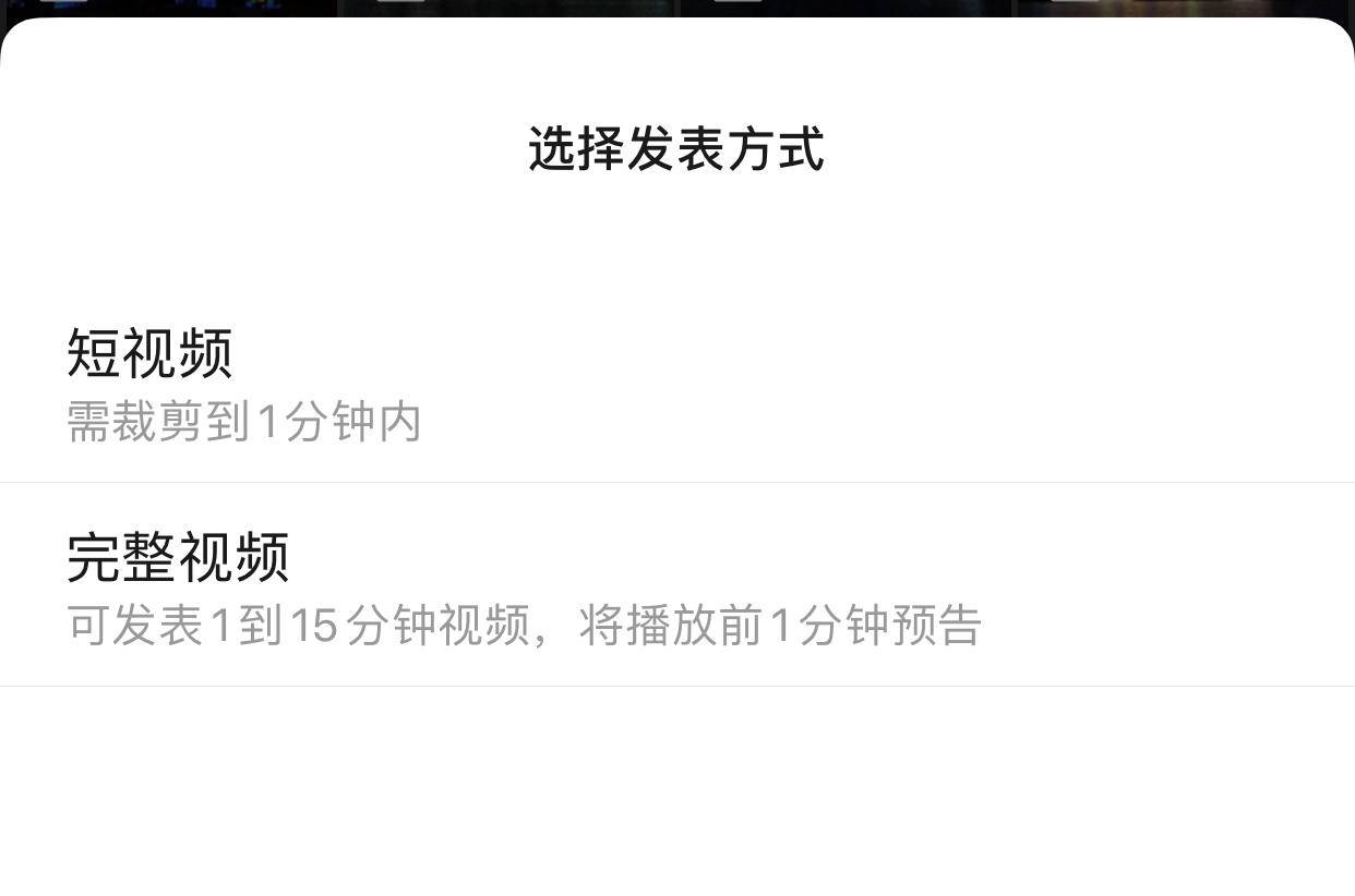 视频号发表新动态增加了完整视频选项,可以发表1到15分钟完整视频,并播放前1分钟预告。也有用户显示可发表1到30分钟完整视频。